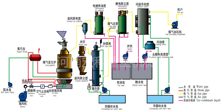兩段式煤氣發生爐是由干餾段和氣化段組成的煤氣化設備。它以40~60mm的煙煤為原料,在煤氣爐上段中進行干餾,干餾生成的半焦進入兩段爐的下段進行氣化反應。煤的干餾和氣化集中在同一氣化爐內完成,對生成的干餾煤氣和氣化煤氣經優化配置的后處理設備分別進行除塵、除油、冷卻、脫硫等工藝處理。經過處理后的潔凈煤氣經加壓輸送系統供給工業窯爐作為燃料使用。整個系統包括煤場、渣場、煤提升系統、煤倉、供煤系統、供風系統、兩段爐氣化系統、除塵凈化系統、冷卻系統、輕焦油捕集及回收系統、酚處理及酚水焚燒系統、脫硫系統、自動控制系統、煤氣貯存及加壓輸出系統。